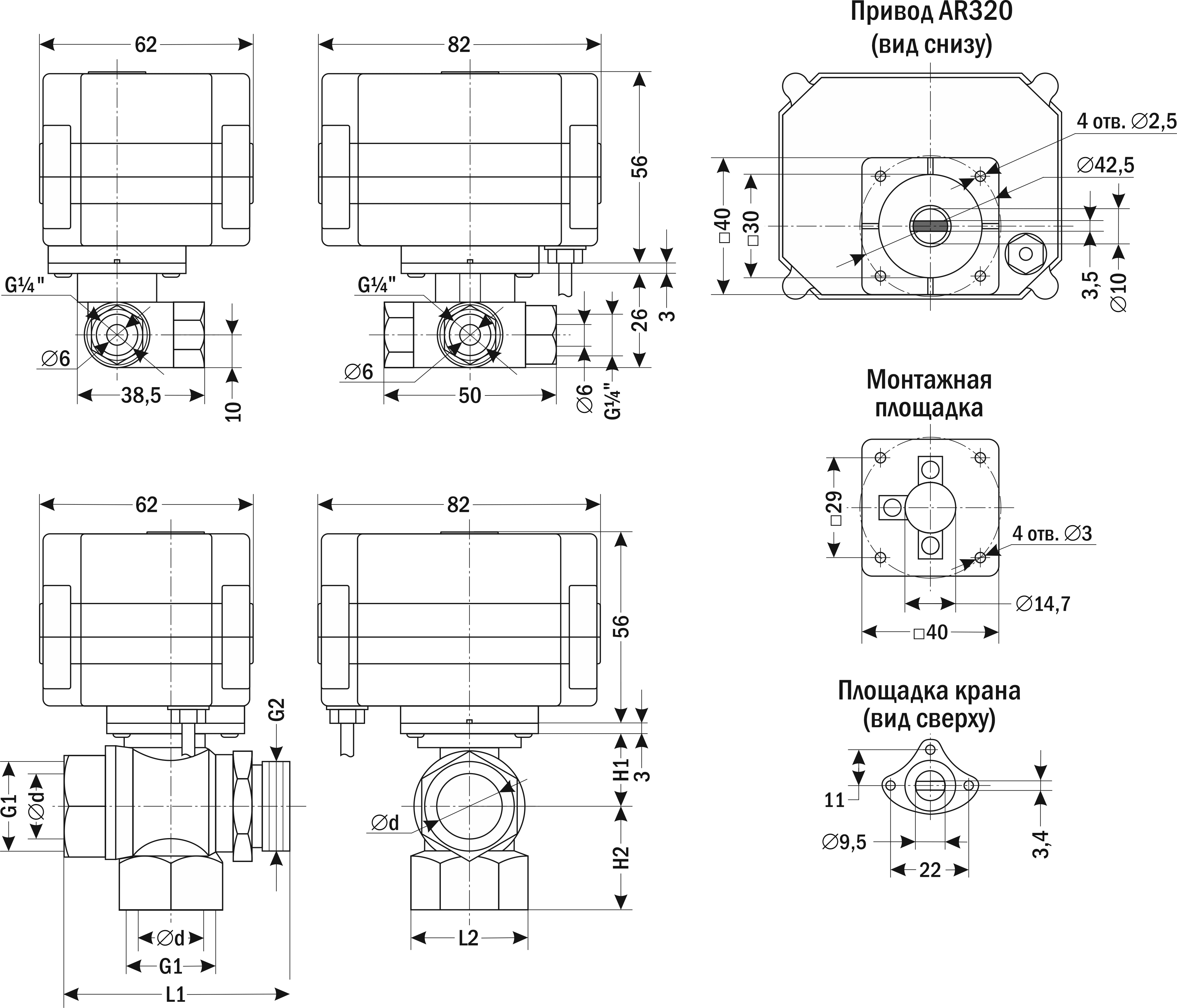 Привод AR350 прикручивается к монтажной площадке кранов AR350-3 четырьмя шурупами ∅ 3 мм, L=10 мм.